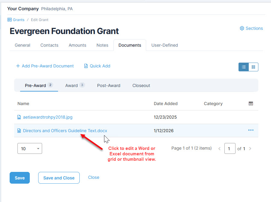 Additionally, users may now edit Excel spreadsheets and Word documents directly within the document viewer. This is extremely useful for clients working in the Grants and Projects modules, where frequent updates on documents are needed.