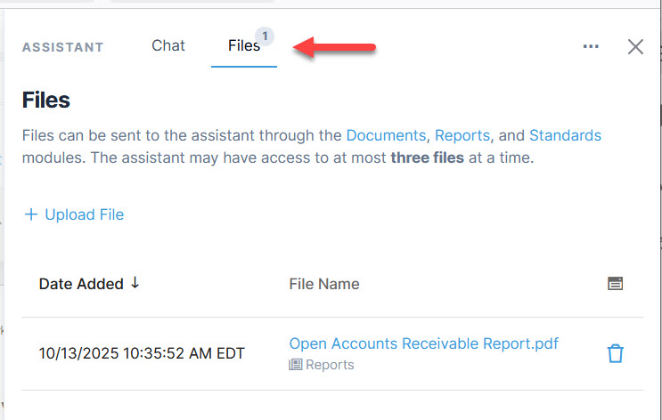 Only files stored within Quadra can be sent to the assistant. Outside files cannot be run through unless they are uploaded to the Documents or Standards modules first.