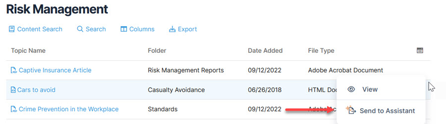 Users can upload documents from the Documents, Reports, and Standards modules to the assistant. Click ‘Send to Assistant’ from the action menu for specific documents and standards.