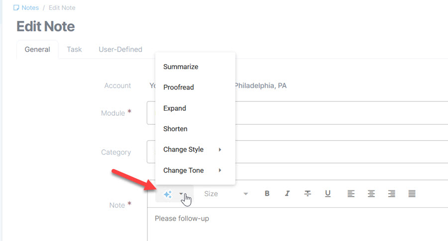 Assistance for composition and editing are available in the Notes module, Grants module, and E-mail Builder. This icon is accessed from the menu bar above the message area. Users can change the tone and ask it to streamline or elaborate on the content entered. Provide details on tasks and assets or provide additional clarity and professionalism in communications. This feature was made possible by incorporating AI into the DevExtreme html editor for more expedient writing and editing.