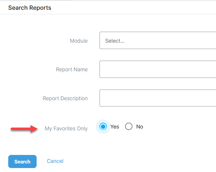 Once you make selections, you can use the search window to display ‘My Favorites Only’ each time you open the Reports module.