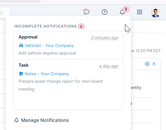 Notifications requiring attention are indicated by a number on the bell icon in Quadra. With this release there is a new method for accessing notifications. Clicking on the icon opens a window that displays a list of the most recent incomplete notifications or overdue tasks. Individual notifications can be accessed through the links shown or click ‘Manage Notifications’ to open the module.