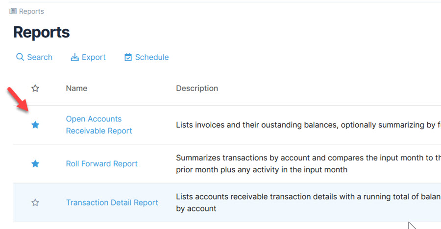 The Reports module has a search window which can be used to filter reports by module, name, or description. However, with version 11, you can also assign certain reports as favorites by selecting the star icon in the Favorites column. This can help you locate the reports you need faster.