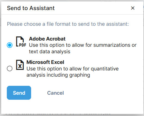Send either PDF or Excel documents or reports to the assistant for semantic or quantitative analyses and ask questions about the content. These results can either be copied from the chat screen or sent to the client by email.