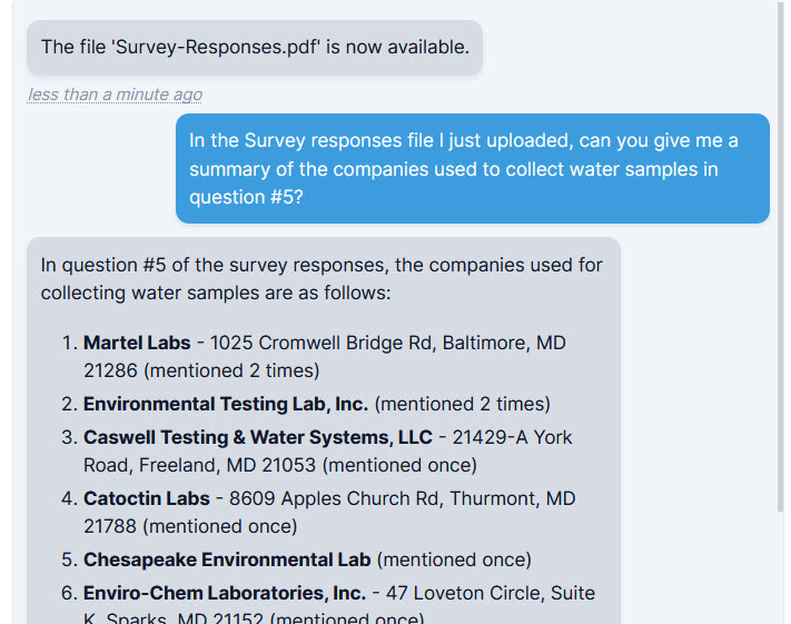 Document analysis by Quadra’s assistant supports team members in finance, operations, risk management, and human resources. With the assistant’s natural language capabilities, clients can easily attain quantitative data and create summarizations from uploaded documents. Intelligent analysis provided by the assistant helps users find insights in A/R transaction and allocation reports to support audits, compile results of open-ended survey responses, investigate questions regarding insurance exposures, and identify potential areas of risk.