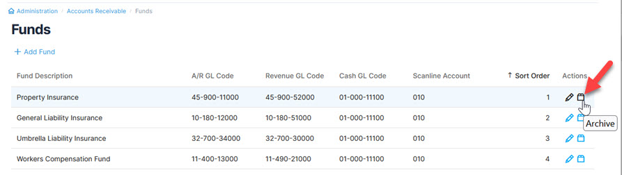 In the Accounts Receivable - Funds section of Administration, the Delete icon has been replaced by the Archive icon. Archiving a fund makes it inactive and removes it from the A/R module and reports: