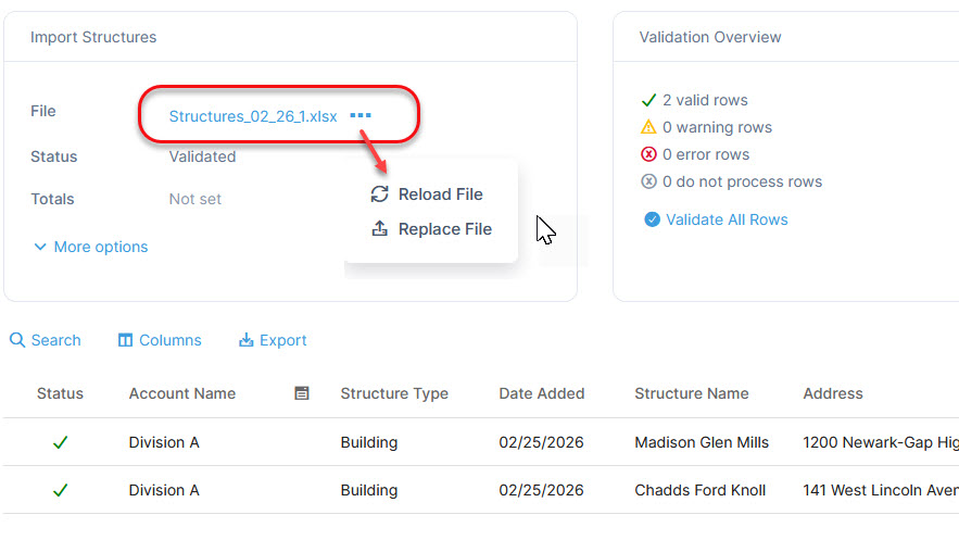 Reload and replace file options are available from the ellipsis next to the file name on the Validate Data step in the import process. Clicking the name of the Excel file will open the document in the document viewer: