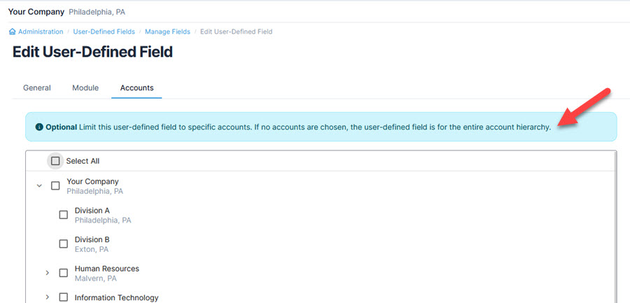 When creating a new UDF, within the account selection tab, the feature has been updated so if no accounts are selected, the UDF will automatically apply to all accounts.