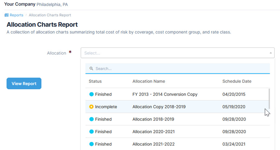 Please note that while allocations with an ‘Incomplete’ status will be available for charges/asset change reports, no data will be visible since only started allocations with invoices and asset changes generated will have data to report from.