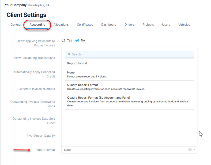 In Administration, a new client setting has been added to the Accounting section. With this setting, users can select a report format for manually entered invoices. Since many of our clients regularly import A/R data into Quadra, this feature greatly simplifies the invoice management process.
