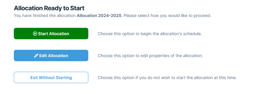 - Once you have clicked Finish! from the previous section, you will be directed to the Allocation Ready to Start page.