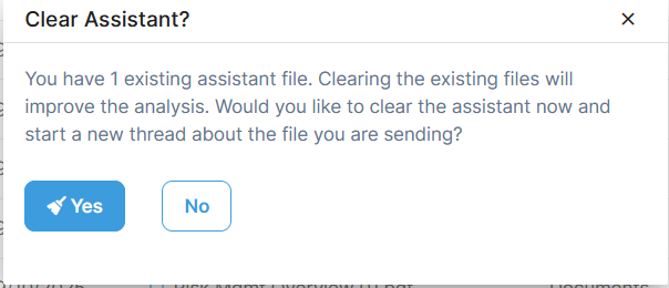 Each time you send a document to the assistant, you will get a notification asking if you want to clear the existing files. Analysis of files will improve if only one file is kept. It is possible to upload multiple files, but the assistant will perform a more streamlined search with one file and is more likely to provide useful answers.