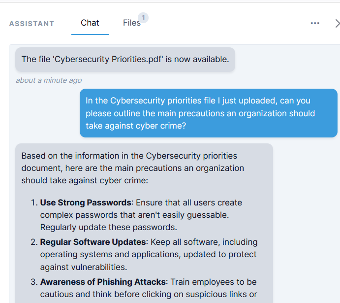 Users can upload documents from the Documents, Reports, and Standards modules to the assistant. By running analyses on these files, the assistant can provide answers and create summarizations and graphs.