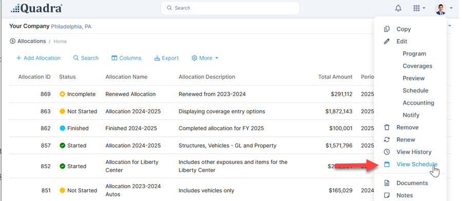 - Select an allocation within the list. Under the action menu, click View Schedule.