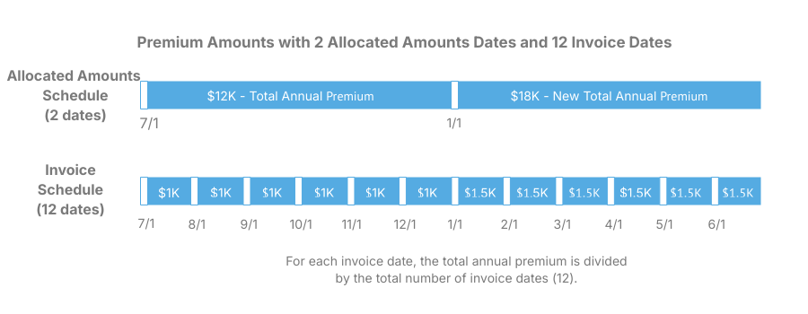 Allocated amounts are annual premiums. Premiums will be divided into installments based on the number of dates in the invoice schedule. In this case, the premium was updated and accounted for in the second allocated amounts date, which occurred mid-year. The new premium is divided by 12 since there are 12 invoice dates within the annual period.
