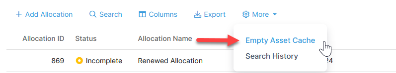 Assets are cached (copied from the database into memory) when you open an allocation. While this improves performance, any changes you make to assets while they are cached will not be reflected in the allocation. Emptying the cache forces them to be reloaded from the database into memory.