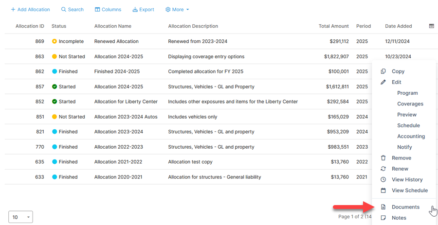 - Find the allocation within the list. Under the action menu, click Documents.