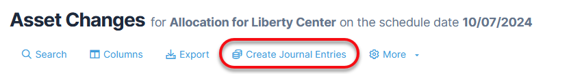 - You will be directed to the Allocations module. On the Asset Changes page for the particular scheduled date, click Create Journal Entries.