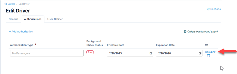 - Under the Authorizations section, locate the check with the status of Error, and select Resubmit.