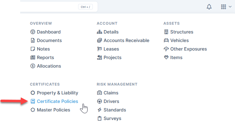 In this module you will create certificate policy templates. You will select an ACORD form and fill in insurer details, effective dates, limits, and other information. These details will then transfer to a Certificate of Insurance, created in the Property and Liability module, which will include names and addresses of the producer and the insured.