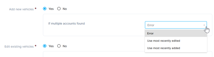 if No is selected for the Add new setting, the Warn and add account option will be removed from the section regarding rows that are not found. This option will be available if Yes is selected for adding new rows.