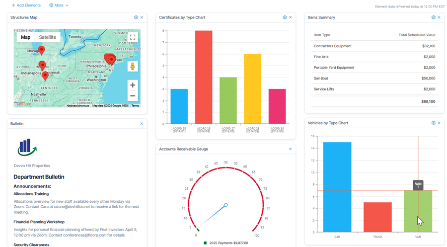 The Dashboard module provides you with summaries, graphs, maps, and more so you can easily view top-level activities. With the Dashboard, you can add and remove elements as well as rearrange the elements in an order that is most helpful to you.