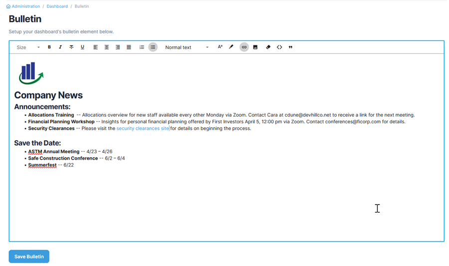 The Bulletin is an element for the Quadra dashboard. The Bulletin can include announcements, reminders of upcoming events, news items, or anything you want to share with users.