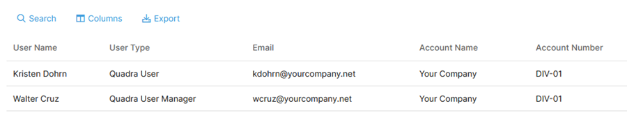 Under Account Details, User Managers can view Quadra users, their roles, associated accounts, and other information.