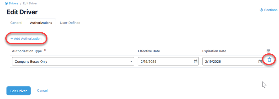 Drivers can have more than one authorization type. Authorization Type information can be adjusted when either Adding a Driver or Editing a Driver.