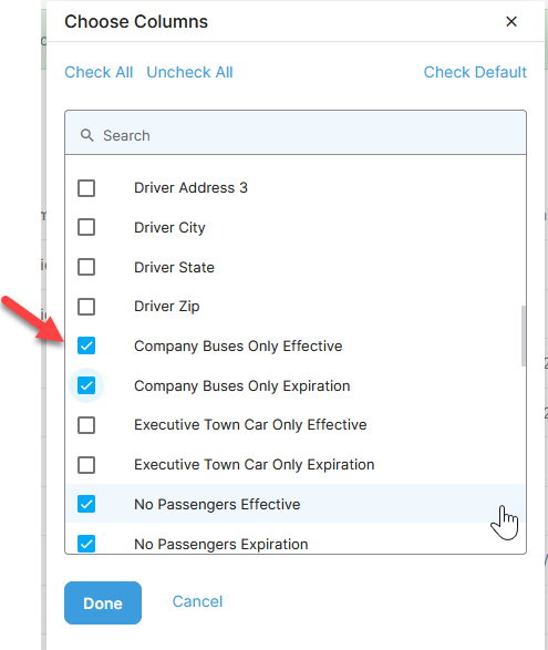 You can view the multiple effective and expiration dates for each authorization type on the main Drivers module page. Select the different options by adjusting the columns for the module grid.