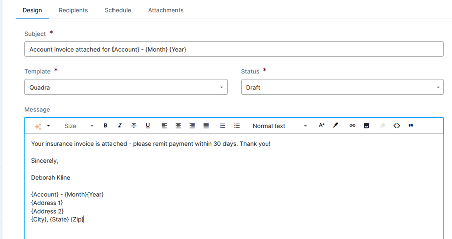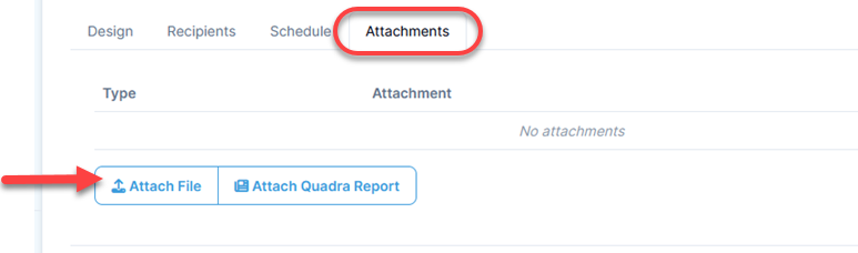 - If you need to include attachments, select the next tab at the top, Attachments. You can attach a file or include a Quadra report. Read more about attaching and editing reports.