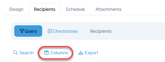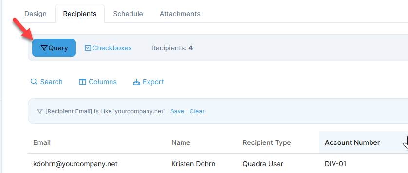 Query: All recipients shown in the grid will receive the email. Use the search function to filter recipients as needed. This method will account for database changes before the email is sent. Read more about using the Query method.