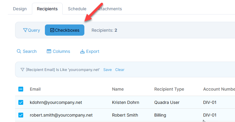 Checkboxes: Only those recipients with checked boxes will receive the email. The grid may still be filtered using the search function, but the boxes must still be checked to assure email receipt. Read more about using the Checkboxes method.