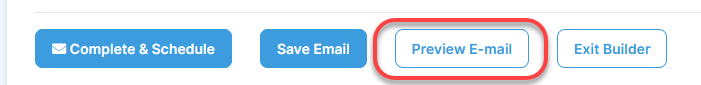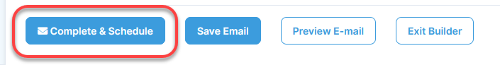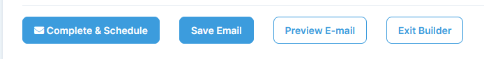 Note these options at the bottom of the E-Mail Builder window: If you need to save your email to send at a later date, click Save E-mail. If you are ready to send your email, click Complete & Schedule. If you click Exit Builder before saving, your changes will not be saved.