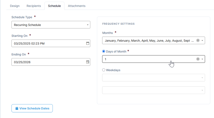 - Under Frequency Settings, select the Months in which you want to send recurring emails. Then either select specific Days of the Month, or specific Weekdays.