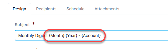 Variable Text: If you want specific information such as Account names to be displayed in the subject line or body of email, use curly brackets to enclose variable text.