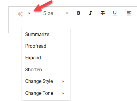 Clicking the AI assistant icon in the editing tool bar will open a menu of options to enhance your message. With natural language you can summarize your content, change the tone, add details, shorten the length, proofread, and more.