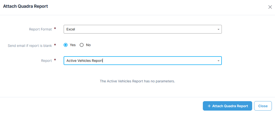 - In the Attach Quadra Report window, make changes as needed regarding the format, report, and report date.