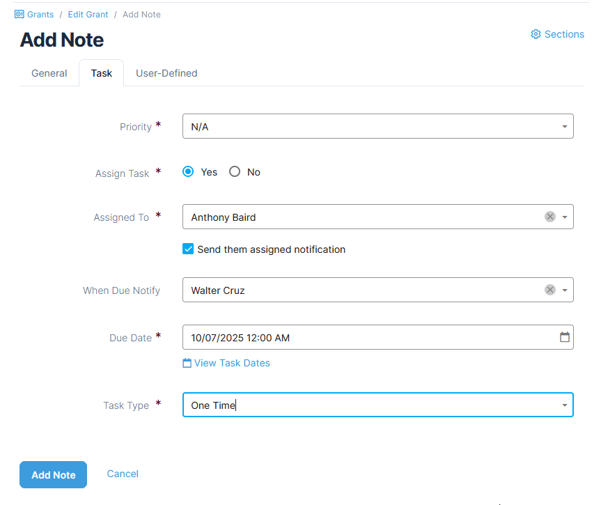If you designate a note as a task, you can assign it to a team member and include a due date. This feature works for notes across all modules in Quadra.