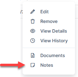 In the Grants module, you can view all of the notes for a grant as a list without going through the phase tabs. Select a grant from the main Grants page and click Notes from the action menu: