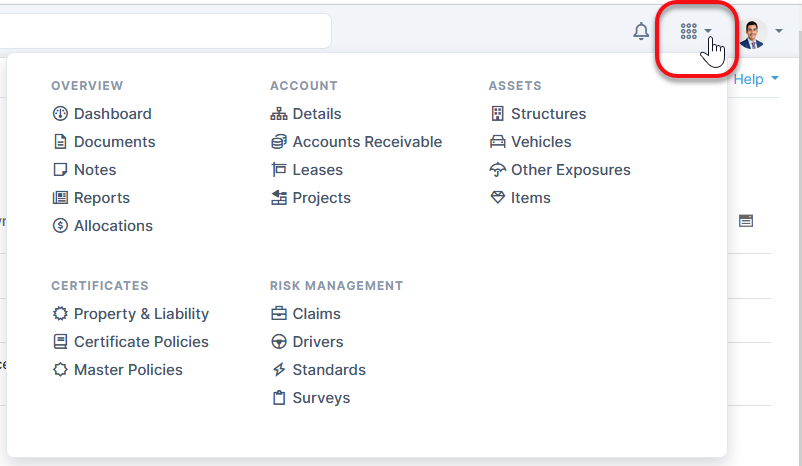 The Module menu is accessed from the icon on the upper right. Clicking a module will take you to the module's page where you can view, edit, or export information.