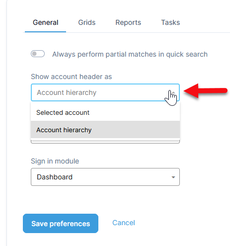 - Under the General tab, make a selection for Show account header as.