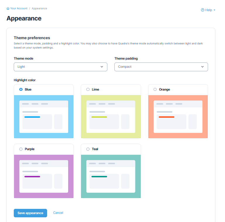 - Under Theme preferences, select a mode, padding, and highlight color.