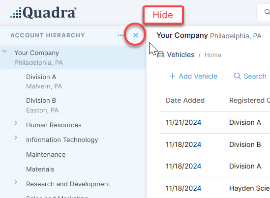 - From within Quadra, show or hide the hierarchy by clicking the icons in the upper right corner of the window.