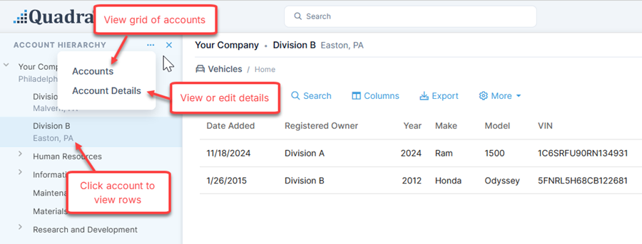 The Account Hierarchy displays the accounts within your organization. The Account Hierarchy, also known as a pyramid, shows a parent-child relationship of entities. Clicking the X next to the organization name (parent entity) expands the list to reveal a submenu of departments or divisions which are referred to as 'accounts' (child entities).