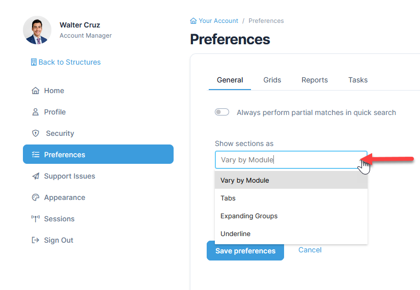 Select 'Tabs', 'Underline', or 'Expanding Groups' under Show sections as. 'Vary by Module' means that the section views can change depending on the module.