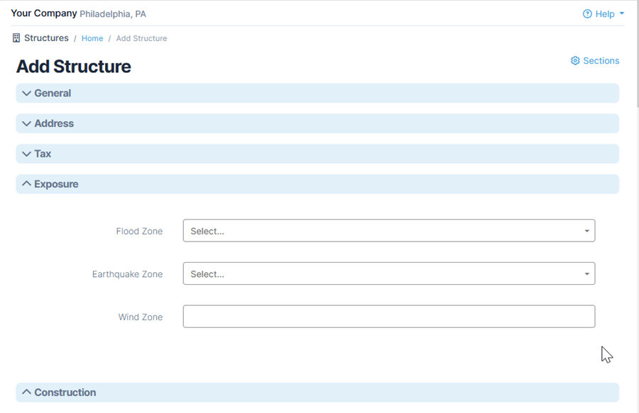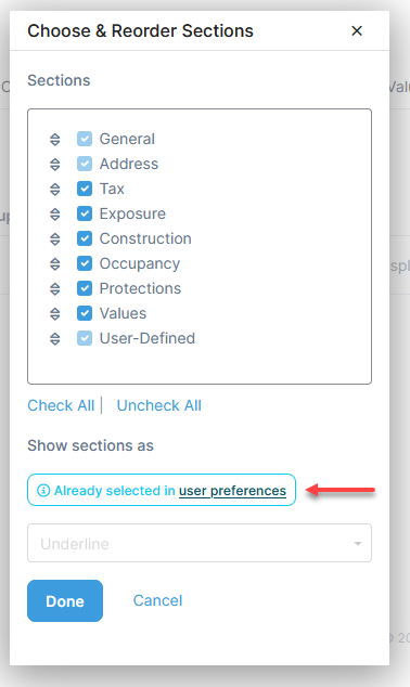 For some modules including Vehicles, Structures, Items, Other Exposures, Drivers, Projects, and Leases, there are three modes available to view sections: Tabs, Expanding Groups and Underline.