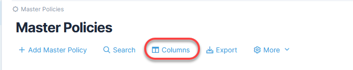 You can adjust which columns are shown in your list of Master Policies by selecting the Columns option in the Module Grid. Read more about adding columns.