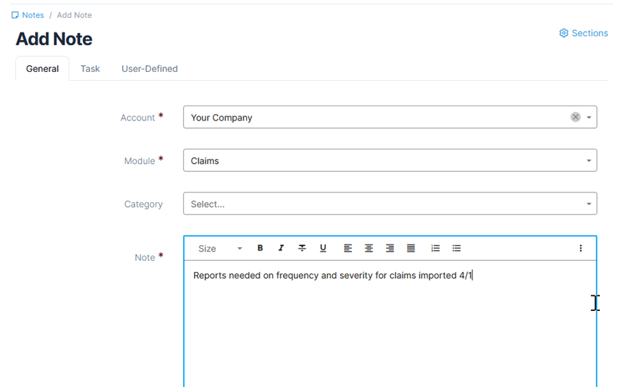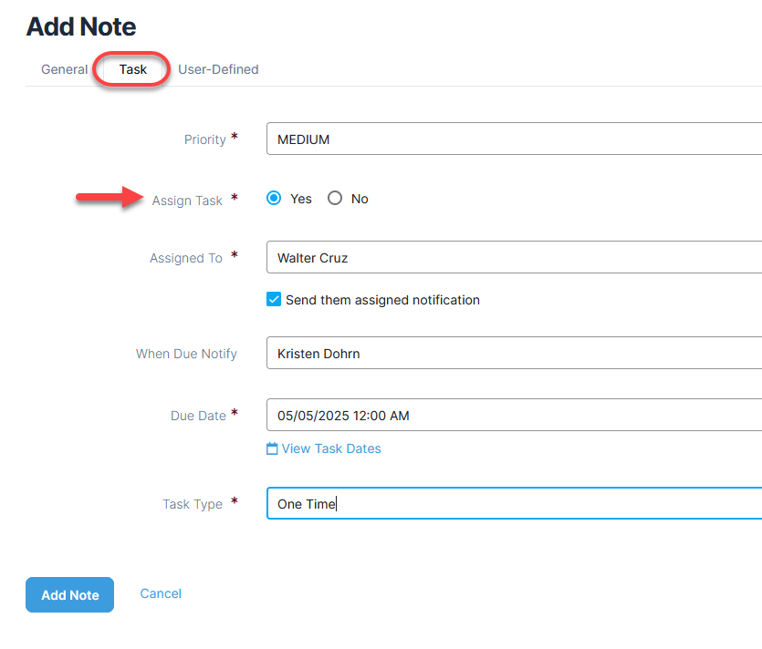 - If the note is a to-do item and needs to be assigned to a user, proceed to the Task tab at the top.