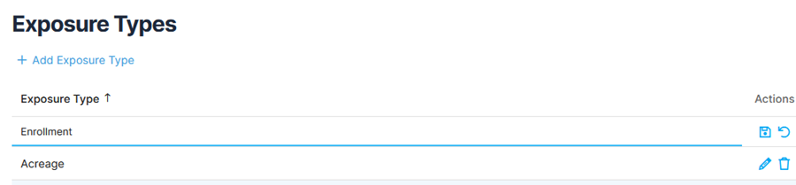 The Other Exposure module includes assets not covered in the other asset modules, such as teachers, parishes, events, payroll, health care plans, pension plans, schools, and more. You can add Exposure Types to fit your company's insurance needs.